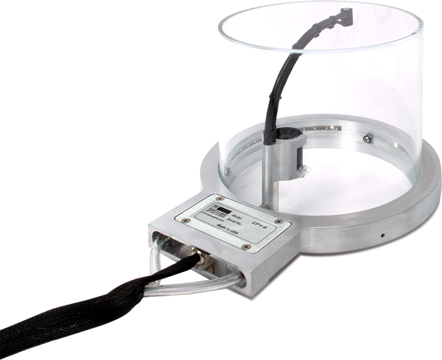 Our CPY-5 Canopy Assimilation Chamber is available for measurement of net canopy CO2 flux on low-lying vegetation and fruit. Constructed of rugged polycarbonate, the interior of the transparent chamber includes a user-adjustable PAR (Photosynthetically Active Radiation) sensor and an air temperature sensor near the soil surface. An air mixing fan and custom manifold system ensures uniform circulation within the chamber. An aluminum ring provides a good seal on the soil surface or on collars*. The Water Vapor Equilibrator comes standard.