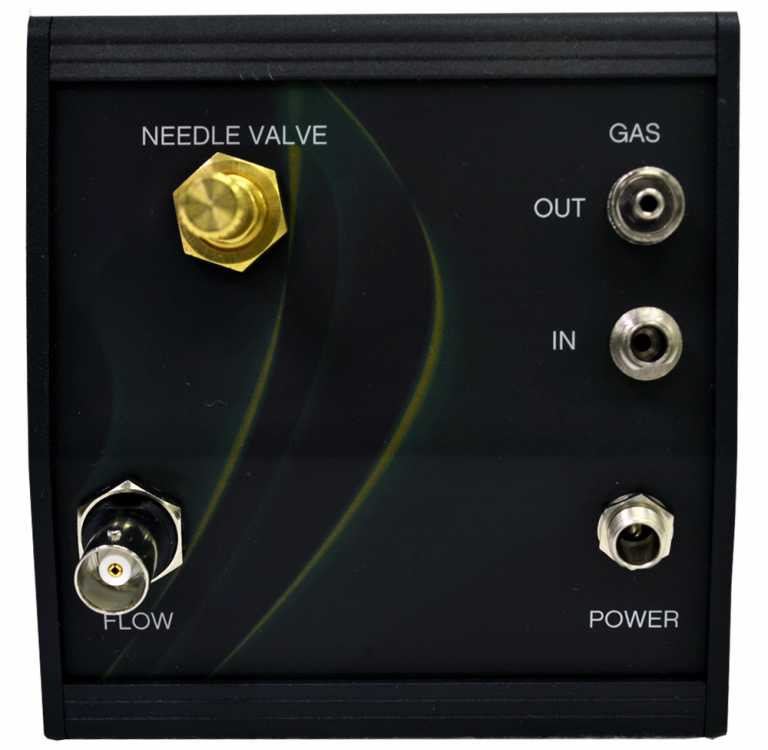 The Q-G265 flow monitor is factory calibrated and measures the mass flow of gas in a flow through system. Specific calibration values are provided for each unit. The flow of gas can be controlled by adjusting it manually with a stainless steel needle valve on the back of the instrument.
