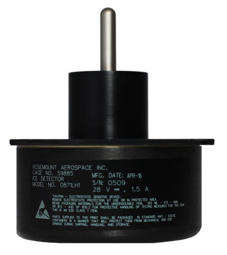 The 0871LH1, manufactured by Goodrich, is a sensor that detects the presence of icing conditions so that appropriate actions can be taken to prevent damage to power and communication lines, to warn of road hazards, or to keep ice off wind turbine blades or a plane’s wings.
