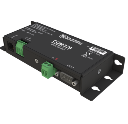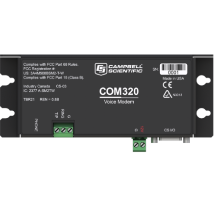 The COM320 is a voice-synthesizer modem that adds speech capability to a CR6, CR800, CR850, CR1000, or CR3000 datalogger. This capability allows the user to call a site for a spoken summary of real-time or historical data. The COM320 can also act as a standard modem.
