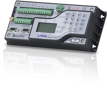 The CR850 is a smaller, research-grade data logger that includes an on-board keyboard display as part of its integrated package. It is intended for smaller configurations in which fewer sensors will be measured. Each CR850 reads input from sensors, then transmits the data via a communication peripheral; most sensors and telecommunication devices are compatible. Multiple CR850s can be configured as a network or units can be deployed individually. This rugged data logger can provide stand-alone operation in harsh, remote environments.