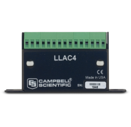 The LLAC4 enables four data logger control ports to emulate pulse-counting channels by converting the low-level ac signals to logic levels read by the control ports. To use the LLAC4, the data logger control ports must accept high frequency pulses. The LLAC4 typically measures anemometers but can measure other sensors that output pulse counting signals.