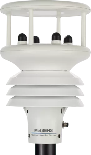 The MetSENS550 compact weather sensor measures wind speed and direction via an ultrasonic sensor, as well as air temperature, relative humidity, and barometric pressure, in a single, combined instrument mounted inside three double-louvered, naturally aspirated radiation shields with no moving parts. An integrated side connector allows users to connect a tipping bucket rain gauge. An integrated electronic compass allows the MetSENS550 to provide accurate, relative wind direction measurements without being oriented in a particular way, making installation easier. WMO average wind speed and direction and gust, temperature, relative humidity, barometric pressure, absolute humidity, air density, wet bulb temperature, rainfall total, and rainfall intensity data are provided.