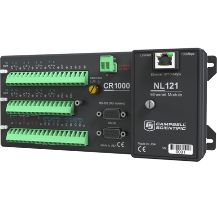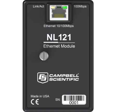 The NL121 is the easiest and lowest-cost way to add an Ethernet interface connection to your CR1000 or CR3000. This small device, about the size of a deck of cards, simply plugs onto the data logger’s peripheral port. Through the NL121, you can access the Internet capabilities of your data logger, such as PakBus, Modbus, and DNP3 over TCP, as well as web, email, file transfer, and cloud-based application clients. You can collect from and control your data logger over any standard IP network—within your office or across the Internet.