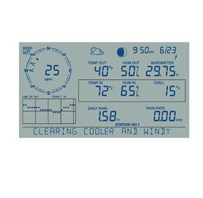 Console may be powered using the included AC-power adapter or with three C batteries (not included). Quick view icons show the forecast at a glance while a moving ticker-tape display gives details. Console also displays on-screen graphs.