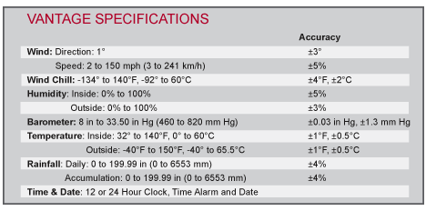 Includes Vantage Pro2 console/receiver, integrated sensor suite, and mounting hardware. Integrated sensor suite includes rain collector, temperature and humidity sensors, anemometer, 40' (12 m) anemometer cable, and solar panel. Electronic components are housed in a weather-resistant shelter. For improved accuracy, temperature and humidity sensors are housed inside a radiation shield