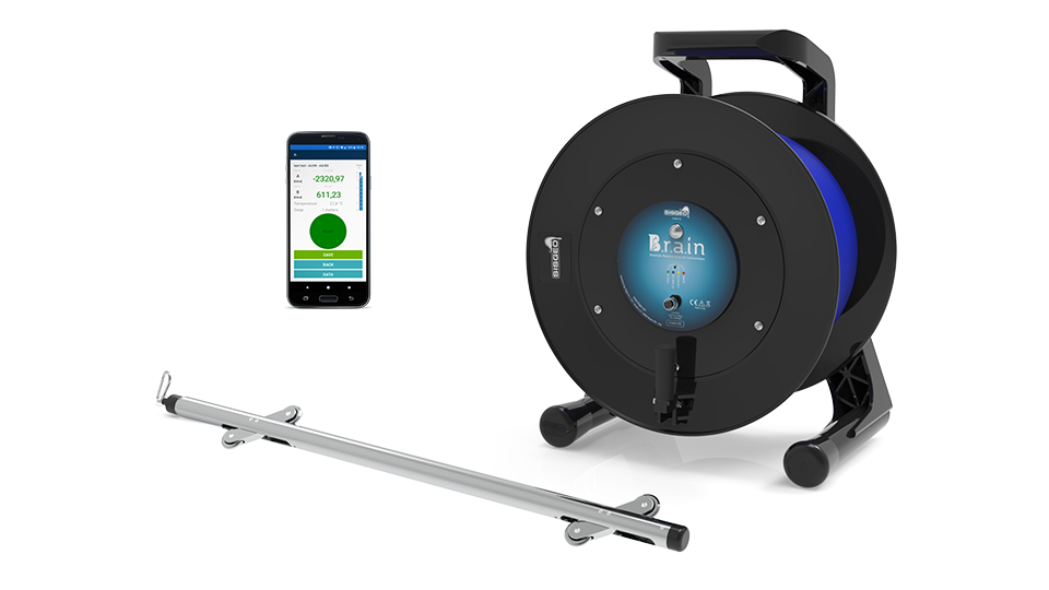 B.R.A.IN (Borehole Readout Array for INclinometers) system is mainly composed by the BRAIN APP compatible with Android and iOS mobile operative systems (device not supplied by SISGEO), digital inclinometer probe (vertical and/or horizontal), and bluetooth reel with control cable.<br />