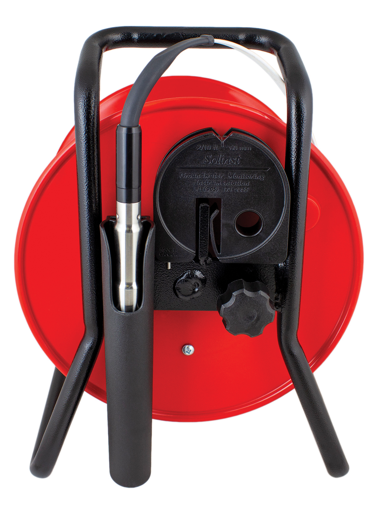 Well casing and well depths are read from durable Solinst laser marked flat tape; lengths to 600 m (2000 ft).
