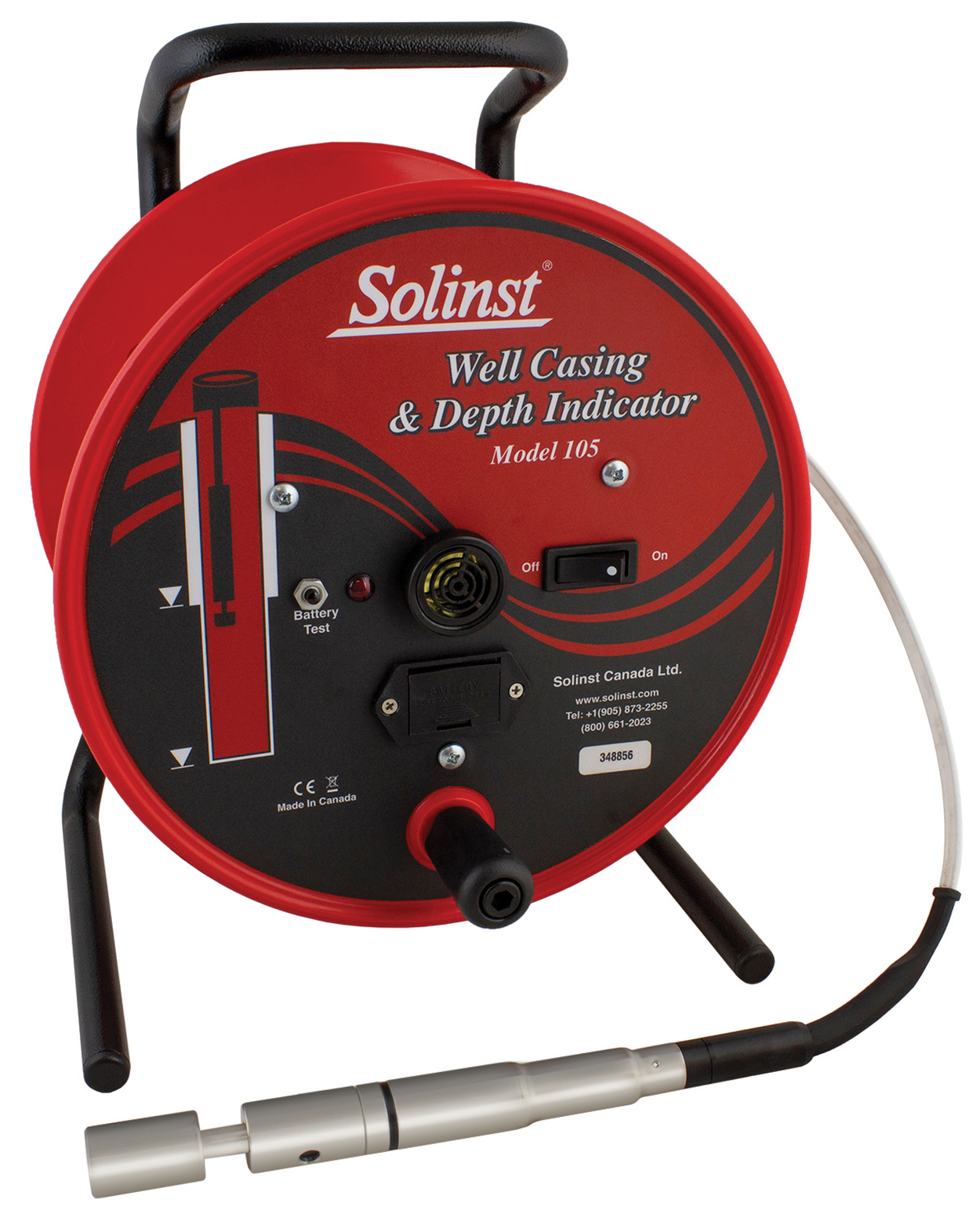The 105 Well Casing & Depth Indicator is used to detect metal well casing and measure total well depth. It offers both of these functions using one probe.