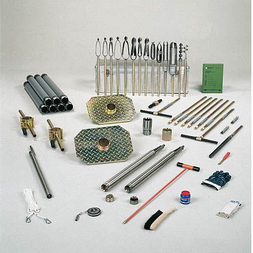 The set contents include: various types of soil augers to reach the groundwater level, augers for the extraction of less-disturbed soil samples, extension rods, synthetic casing tubes with steel screw thread sockets, tube clamps with adjustable quick fastener for driving in and withdrawing the casing tubes, bailers with steel and synthetic valves, casing tube platforms for more ergonomic working, spare parts and various accessories. The set is delivered in two aluminium transport cases