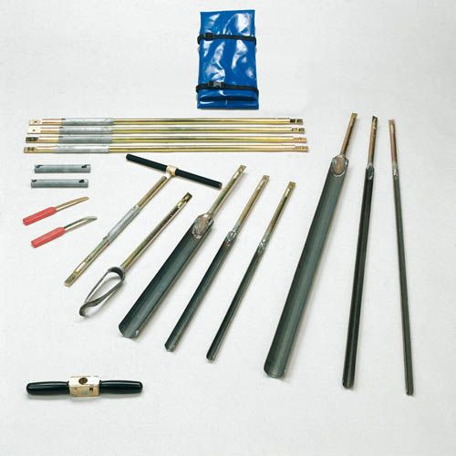 The bi-partite gouge auger set SA is a standard set for sampling in more or less soft soils to a depth of 5 metres. The set has a bayonet connection and contains gouge augers with various lengths and diameters, and Edelman auger, extension accessories, push-/pull handle and a strong carrying bag for transport in the field