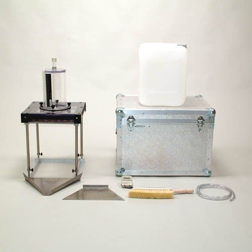 The simulator allows erosion to take place on a small section of the plot. With the apparatus, rainfall is simulated on a slanting surface. Through small capillaries in the plate under the water-filled cylinder, the drops fall down on the slanting surface.