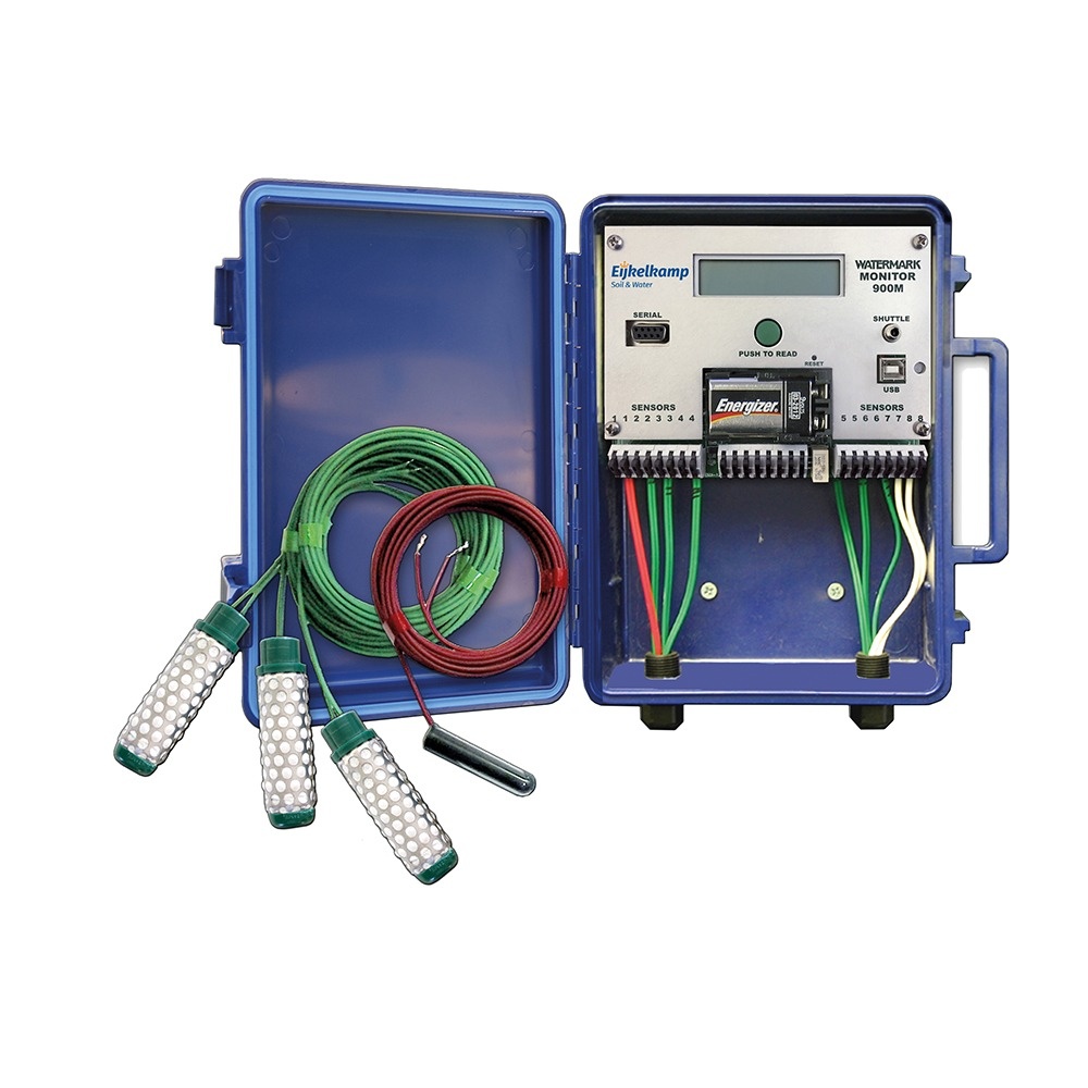 Watermark monitor. Complete set for automatic logging of soil moisture data, consisting of datalogger, 7 Watermark sensor (5x with 6 m cable and 2x with 10 m cable), temperature sensor, software and RS232 communication cable. Inclusive quick connectors and PVC installation pipe.