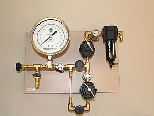The 0700G2 Pressure Control Manifold is designed for regulating and monitoring the pressure supplied to the 1500F2, 15 Bar Pressure Plate Extractor. It is comprised of an air filter, pressure regulators, control valves, and test gauges. Mounted by standoffs to a 3/4" (19 mm) thick baseboard suitable for mounting on a laboratory wall. (The Connecting Hose, 0779G1, from the manifold to the compressor is ordered separately).Output pressure can be regulated from 10 to 250 psi (0.7 to 16 bars). Double regulation is provided in the 5 to 150 psi (0.3 to 10 bars) range. Readout pressure test gauge is graduated from 0 to 300 psi (0 to 20 bars), in 2 psi and 0.1 bar intervals.