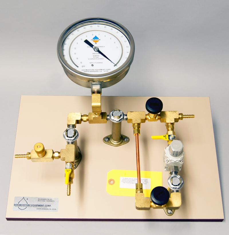 Precise low-pressure vacuum control manifold designed for use with 1000, 15 Bar Pressure Membrane Extractor, the 1500F2, 15 Bar Pressure Plate Extractor and the 1600F1, 5 Bar Pressure Plate Extractor. Allows low tension work with a high degree of pressure stability and accuracy, unattainable with pressure regulators. 2008F1, Vacuum pump sold separately. The 0725G1, Vacuum Control Manifold is designed for regulating and monitoring the vacuum supplied to pressure extractors for low tension work. It is comprised of control valves, tubing and connectors, and a precision vacuum test gauge. Mounted by standoffs to a 19 mm thick baseboard suitable for mounting on a laboratory wall. Output vacuum can be regulated from 0 to minus 15 psi (0 to minus 1 bar). The readout vacuum gauge is graduated from 0 to minus 15 psi (0 to minus 1 bar) in 0.1 psi and 0.005 bar intervals.