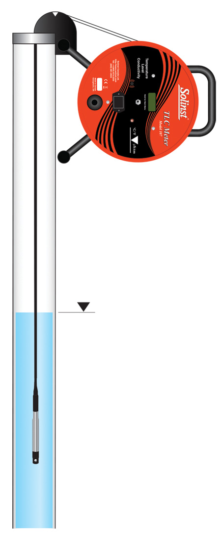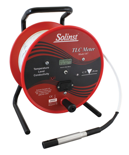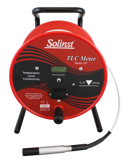The 107 TLC Meter (Temperature, Level, Conductivity) displays accurate measurements of conductivity and temperature on an convenient LCD screen. Water levels are read off the accurately laser marked Solinst flat tape when the light and buzzer are triggered.