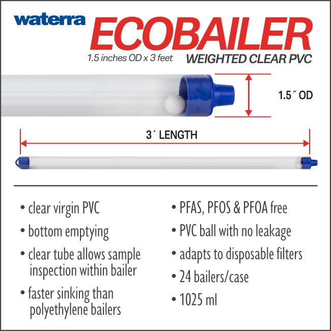 Weighted Clear PVC Eco Bailers use the same design as the popular Clear PVC Eco Bailers for sampling groundwater. They also feature a thicker tube wall than competing models. As a result, our Weighted Eco Bailers are less likely to bend when handled. Bent bailers will oscillate when traveling down the well column and they will sink more slowly.