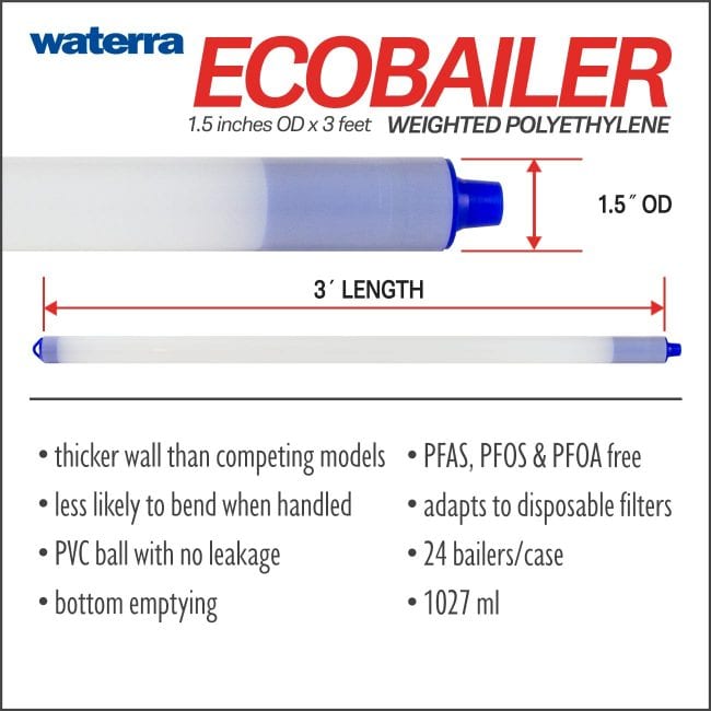 Weighted Polyethylene Eco Bailers use the same design as the popular Clear PVC Eco Bailers. They also feature a thicker tube wall than competing models. As a result, our Weighted EcoBailers are less likely to bend when handled. Bent bailers will oscillate when traveling down the well column and they will sink more slowly.
