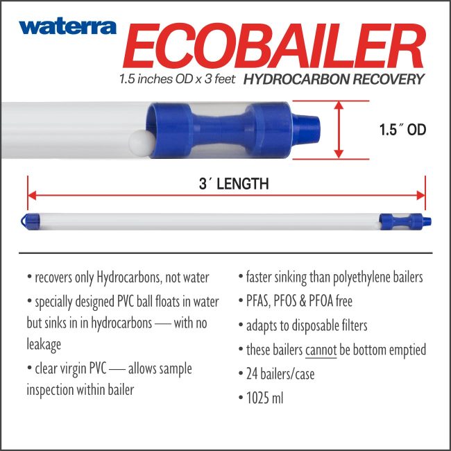 The Clear PVC Hydrocarbon Recovery Eco Bailer recovers only Hydrocarbons. It is designed to help you remove the LNAPL, floating hydrocarbon product, from your monitoring wells without removing water as well.